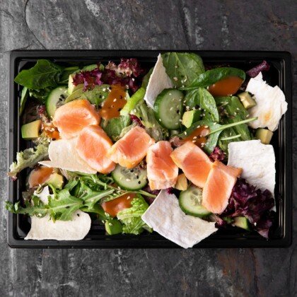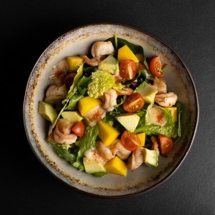 куриное филе гриль, микс салатов, шампиньоны в соусе пад-тай, запеченный болгарский перец, томаты черри, оливковое масло, шичими